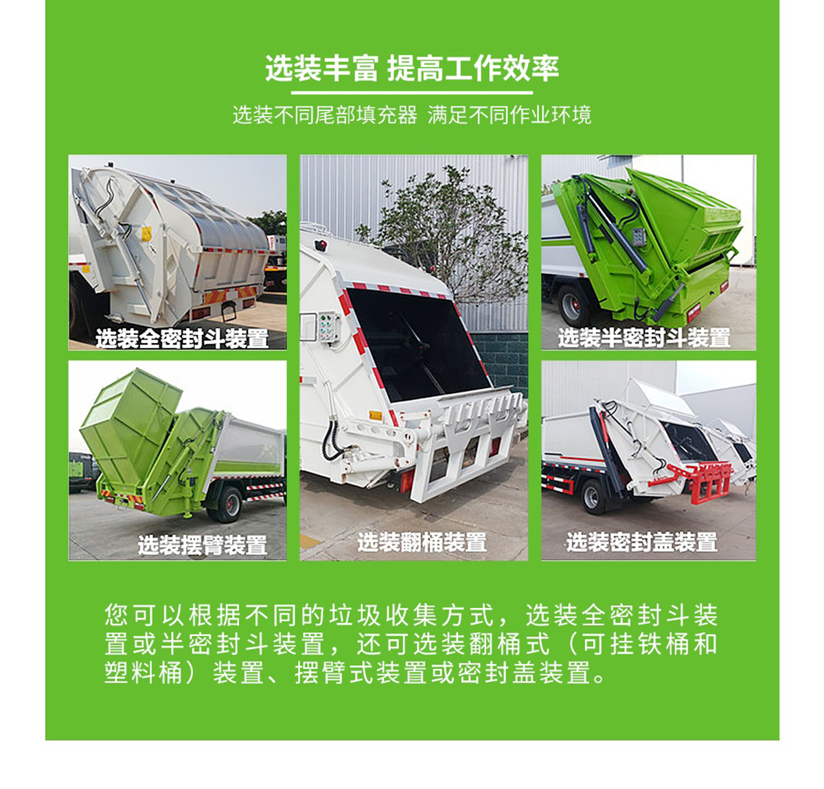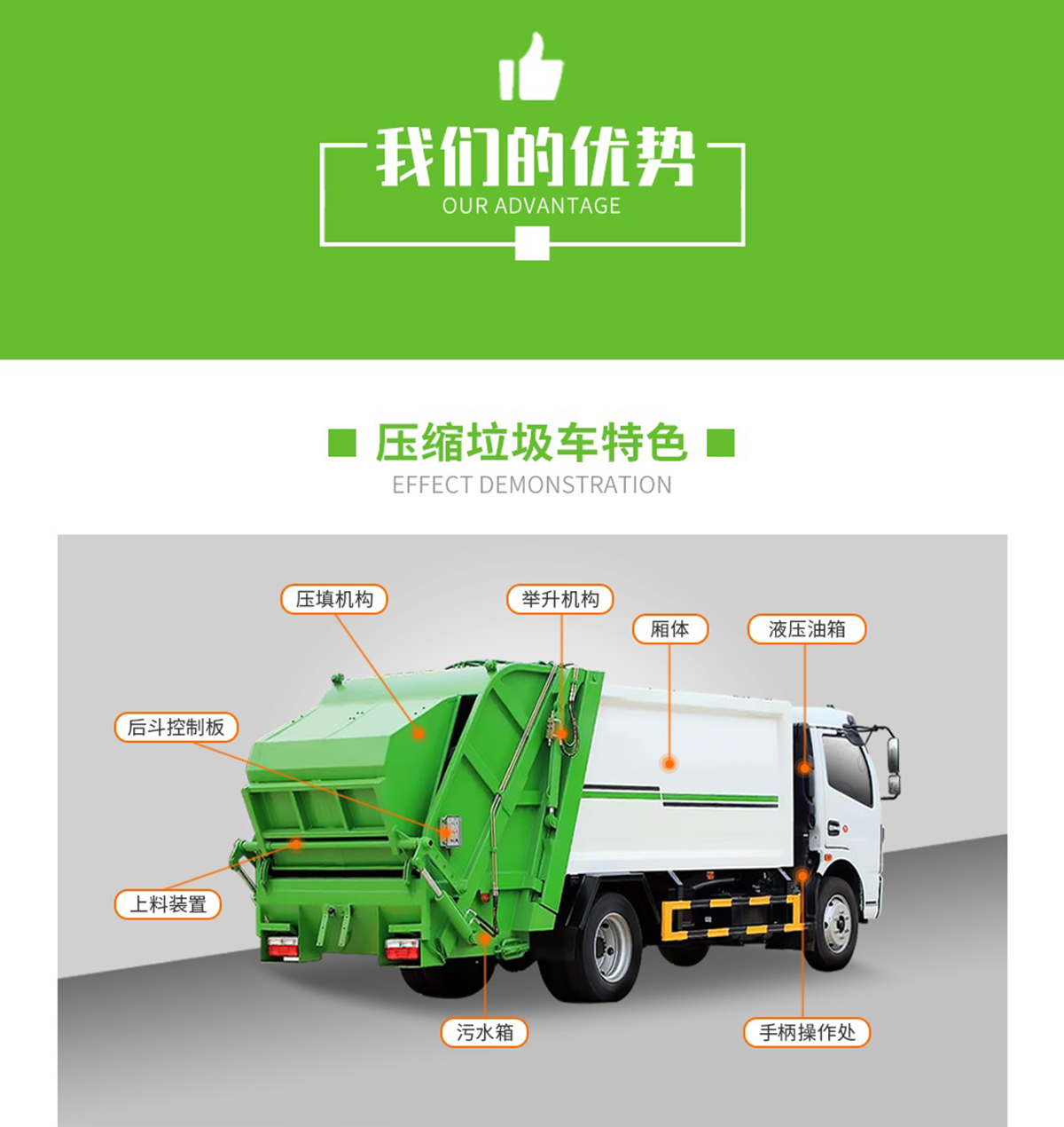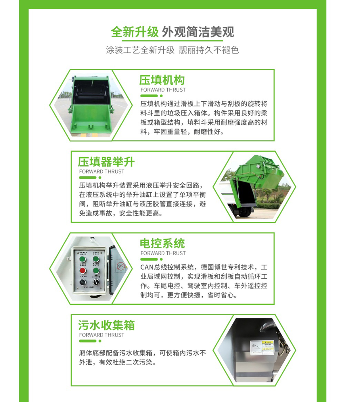 底盤配置: 配置一:云內(nèi)150馬力,萬里揚(yáng)6檔變速箱,前橋2.2噸,后橋4.2噸,8.25鋼絲胎,斷氣剎,ABS,空調(diào),氣囊座椅,電動窗,中控鎖。 配置二:玉柴165馬力,萬里揚(yáng)六檔箱,190mm雙層大梁,8.25R20鋼絲胎,2.4/6前后橋,帶空調(diào),氣囊座椅,遙控鑰匙,行車記錄儀。 上裝配置:1,新款弧形箱體,增加箱體容積,整車更美觀,箱體為碳鋼制作,底箱及填充器采用加厚鋼板,耐腐蝕使用壽命長,一層油漆噴涂處理。2,裝載循環(huán)時間=25S;垃圾排出時間≤25S;填料提升角度≥95°,壓縮比例為1/3-1/2,一裝部分具備雙向壓縮和蠕動壓縮功能帶。3,新款結(jié)構(gòu)加大填充器,手電一體操作模式,帶駕駛室操作,帶駕駛室一鍵卸料功能,3308軸距以上配遠(yuǎn)距離遙控器,尾部裝置可以選裝垃圾翻轉(zhuǎn)斗,掛桶翻轉(zhuǎn)板或者大落地斗。4,CAN總線控制方式,光電開關(guān)加延時雙系統(tǒng)控制,降低故障率,方便維修。5,帶夜間照明裝置,6方)及以上車型帶雙污水箱,污水箱排水球閥和排水蓋,增加排水管,防止濺水,人性化設(shè)計。6,標(biāo)配選用:威森搏樂油缸,威森搏樂多路閥,3308軸距以上配備壓實閥(背壓閥),所有車型標(biāo)配單泵。5000軸距、后八輪車型標(biāo)標(biāo)配雙聯(lián)泵,大油量多路閥。 選裝配置:大落地斗,帶后擺臂,另帶單一掛桶裝置,尾部密封蓋手動/氣缸控制,雙聯(lián)泵(多路閥聯(lián)數(shù)增加,液壓泵加大,液壓油箱加大)。 |