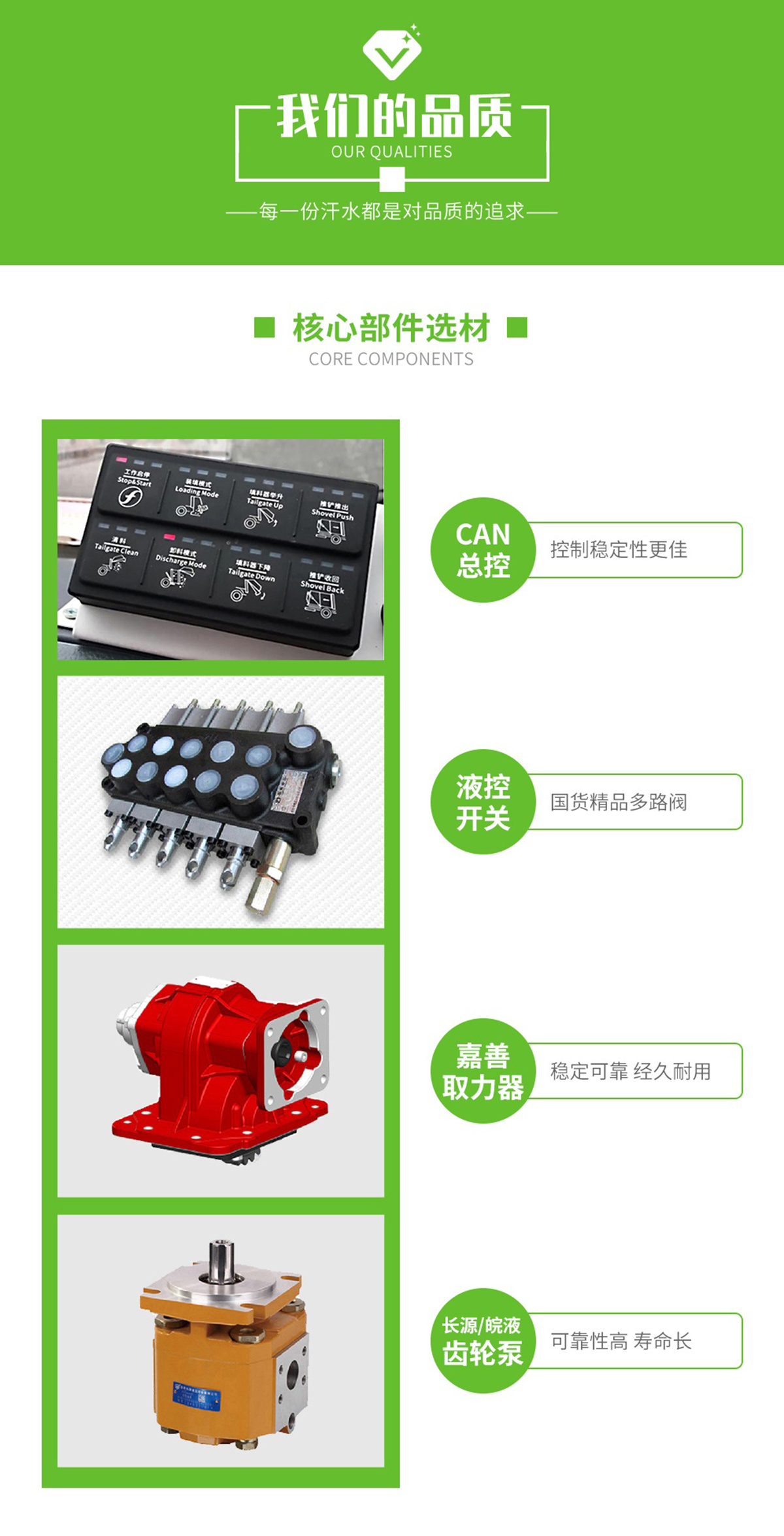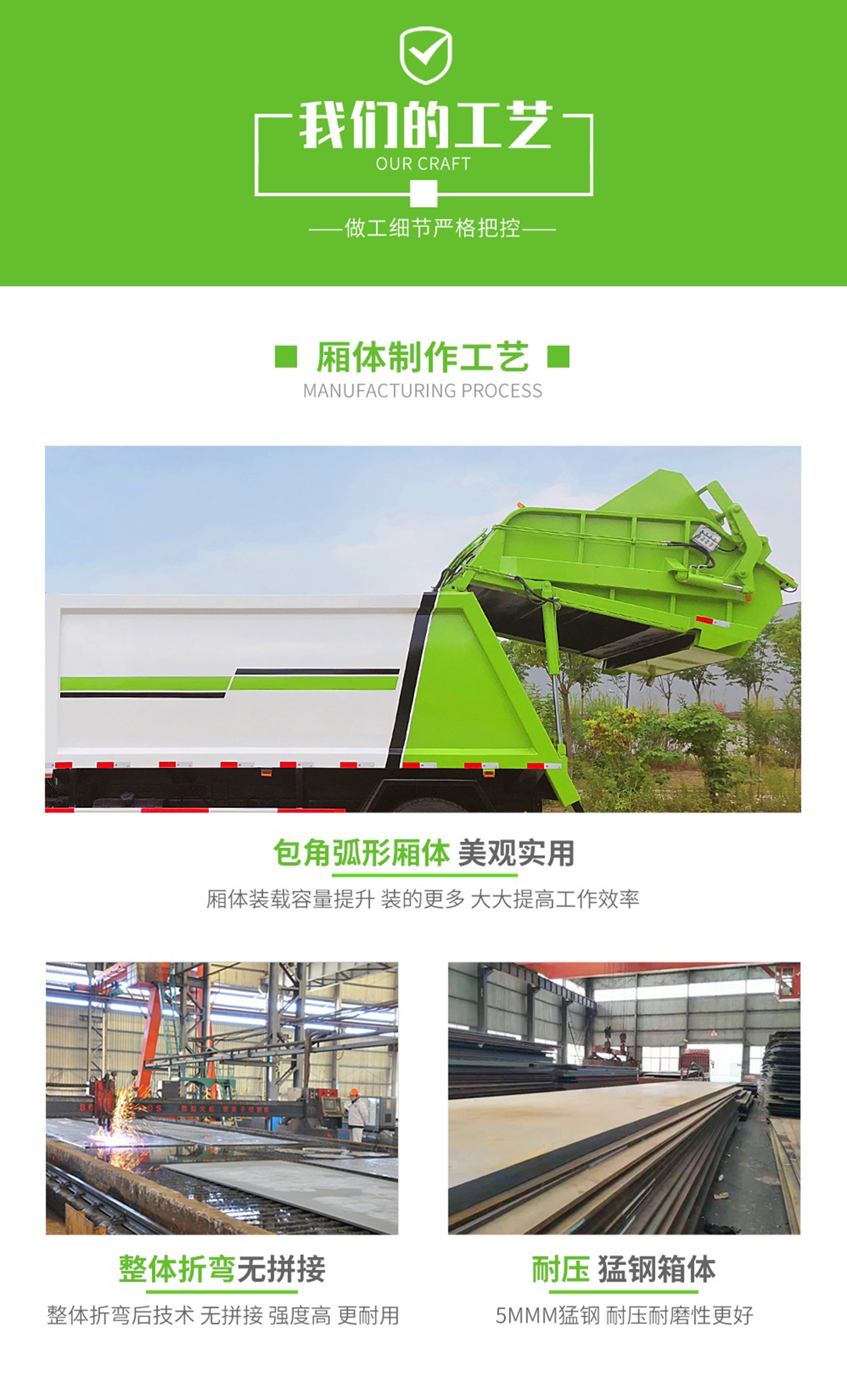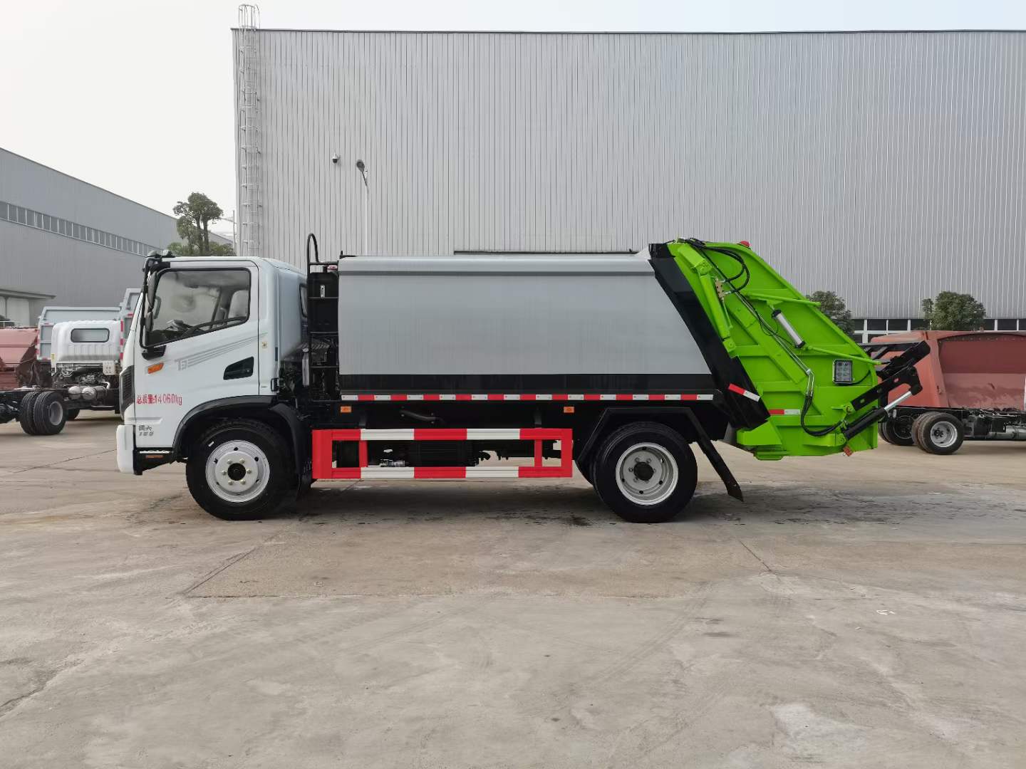 底盤配置: 配置一:云內(nèi)150馬力,萬里揚(yáng)6檔變速箱,前橋2.2噸,后橋4.2噸,8.25鋼絲胎,斷氣剎,ABS,空調(diào),氣囊座椅,電動窗,中控鎖。 配置二:玉柴165馬力,萬里揚(yáng)六檔箱,190mm雙層大梁,8.25R20鋼絲胎,2.4/6前后橋,帶空調(diào),氣囊座椅,遙控鑰匙,行車記錄儀。 上裝配置:1,新款弧形箱體,增加箱體容積,整車更美觀,箱體為碳鋼制作,底箱及填充器采用加厚鋼板,耐腐蝕使用壽命長,一層油漆噴涂處理。2,裝載循環(huán)時間=25S;垃圾排出時間≤25S;填料提升角度≥95°,壓縮比例為1/3-1/2,一裝部分具備雙向壓縮和蠕動壓縮功能帶。3,新款結(jié)構(gòu)加大填充器,手電一體操作模式,帶駕駛室操作,帶駕駛室一鍵卸料功能,3308軸距以上配遠(yuǎn)距離遙控器,尾部裝置可以選裝垃圾翻轉(zhuǎn)斗,掛桶翻轉(zhuǎn)板或者大落地斗。4,CAN總線控制方式,光電開關(guān)加延時雙系統(tǒng)控制,降低故障率,方便維修。5,帶夜間照明裝置,6方)及以上車型帶雙污水箱,污水箱排水球閥和排水蓋,增加排水管,防止濺水,人性化設(shè)計。6,標(biāo)配選用:威森搏樂油缸,威森搏樂多路閥,3308軸距以上配備壓實閥(背壓閥),所有車型標(biāo)配單泵。5000軸距、后八輪車型標(biāo)標(biāo)配雙聯(lián)泵,大油量多路閥。 選裝配置:大落地斗,帶后擺臂,另帶單一掛桶裝置,尾部密封蓋手動/氣缸控制,雙聯(lián)泵(多路閥聯(lián)數(shù)增加,液壓泵加大,液壓油箱加大)。 |