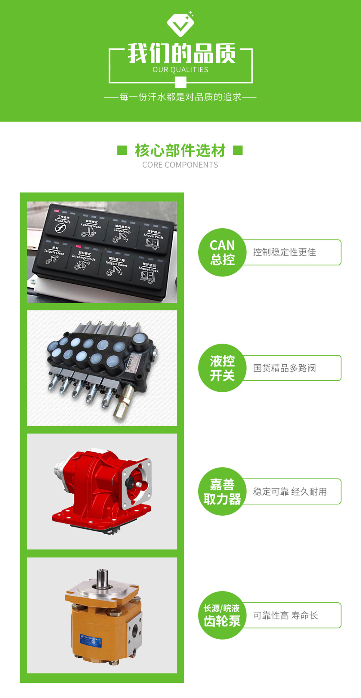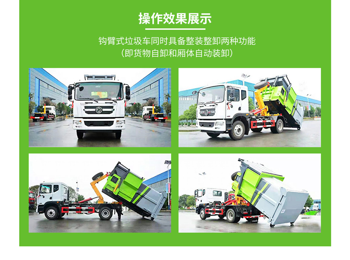 上裝配置:配套12~14方勾臂垃圾箱,主勾臂由高強度板材制作,雙油缸,國產多路閥,液壓油泵,標配駕駛室外部操作,可選裝駕駛室室內操作,選裝液壓后支腿,防誤操作,帶平衡閥,液壓鎖。