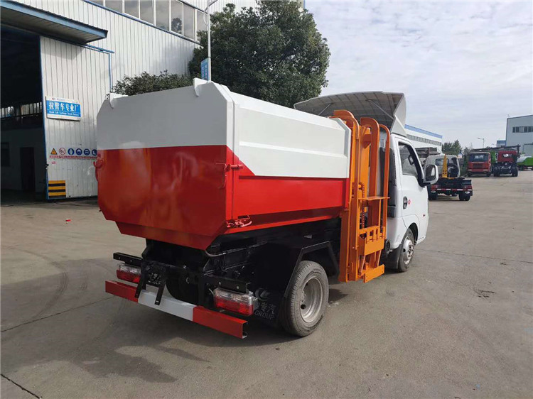 自動舉升垃圾桶倒入垃圾,提升機頂部帶機械翻蓋,箱體底部雙液壓舉升自卸,箱體后部設有擋水槽,尾部裝有橡膠密封條,防污水滴漏。